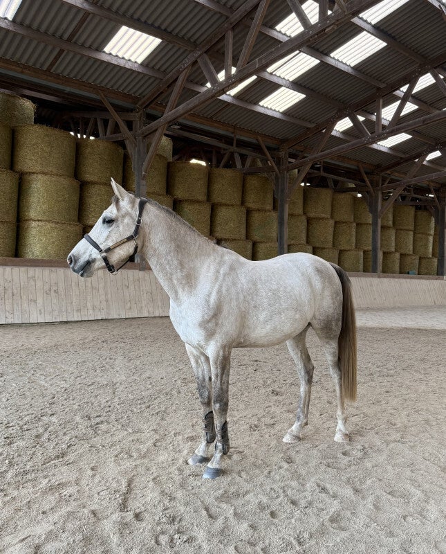 super cheval de 4 ans, bientôt 5 ans (avril 2026), hongre, 1m58 au garrot et continue de grandir, avec un mental exemplaire et une vraie envie de bien faire.
